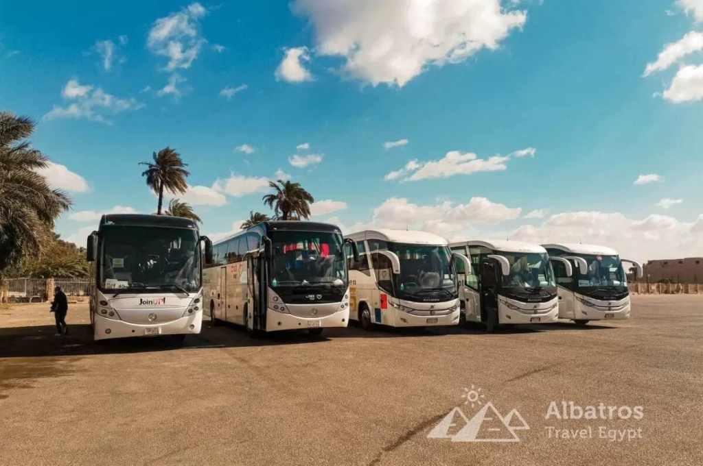Nach der Abholung beginnt die Fahrt im klimatisierten Reisebus durch die Wüstenlandschaft. Während der Fahrt erklärt die Reiseleitung den Tagesplan, Sicherheitsregeln und gibt erste historische Einblicke. Regelmäßige Pausen erhöhen den Komfort und machen die lange Strecke angenehmer.